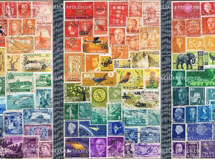 The postage stamps are individually collaged into place with an acid-free, xylene-free adhesive then coated with a matt sealant for extra protection. They still bear fragments of postmarks and other cancellation marks as a testament to their former active service with postal services around the world.