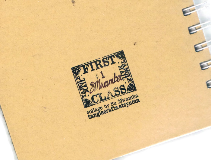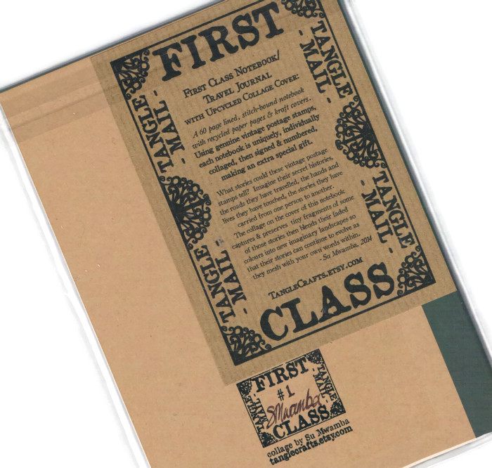 The front cover is entirely covered with used postage stamps, then coated with a matt sealant for extra durability. The back cover is left blank, except for a hand-stamped TangleCrafts maker's mark, which has been signed & numbered (a different numbered notebook is shown: example only). A small insert is included (similar to the one shown), providing a little First Class Notebook background info - great for a gift!