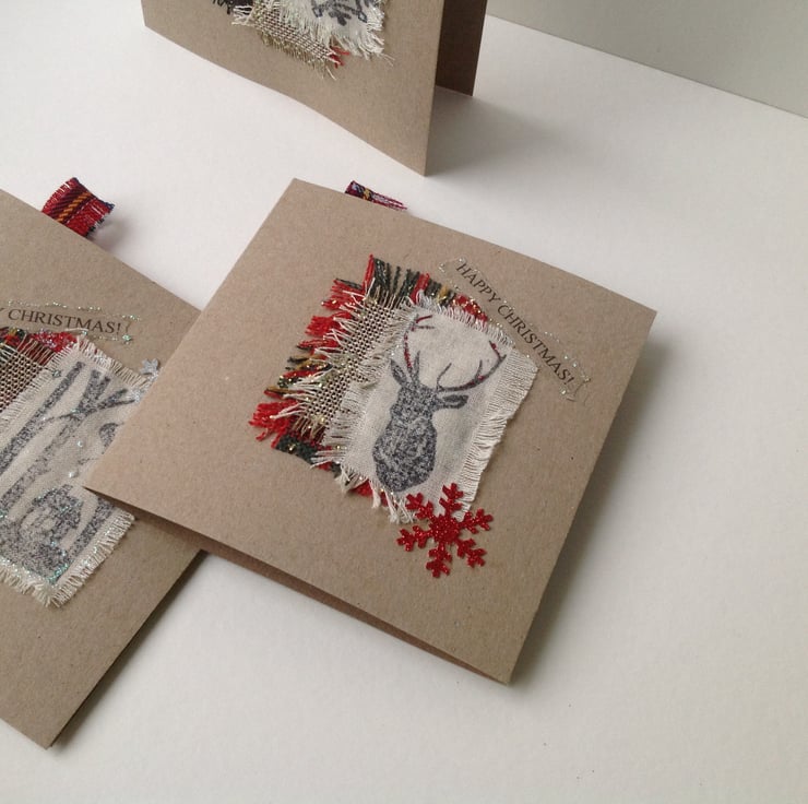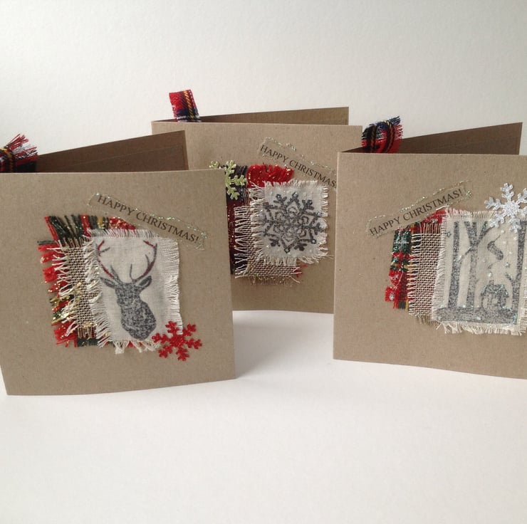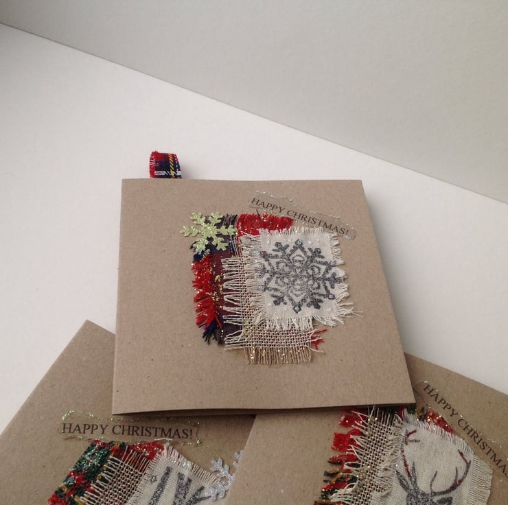 The design itself consists of frayed tartan, and hessian fabric and a top layer of cream linen fabric which shows a stamped seasonal image-