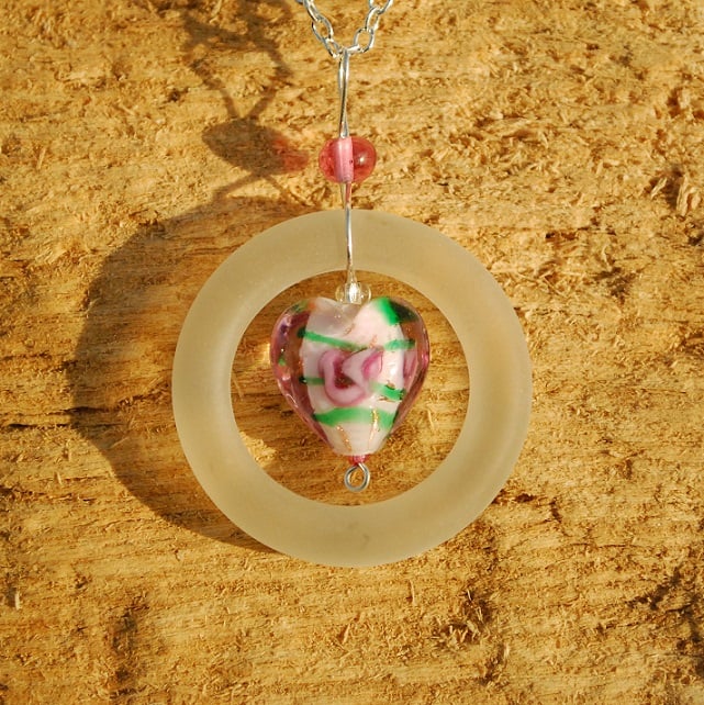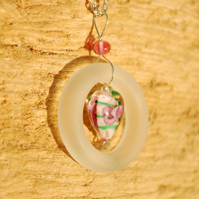 We found the glass ring we have used to make this delightful pendant on the beach. It is the neck of an old bottle or cream pot. We have trimmed it and tumbled it until it is perfectly smooth and finely frosted. The white frosted glass looks wonderful with the pretty rose heart in the centre of the pendant.