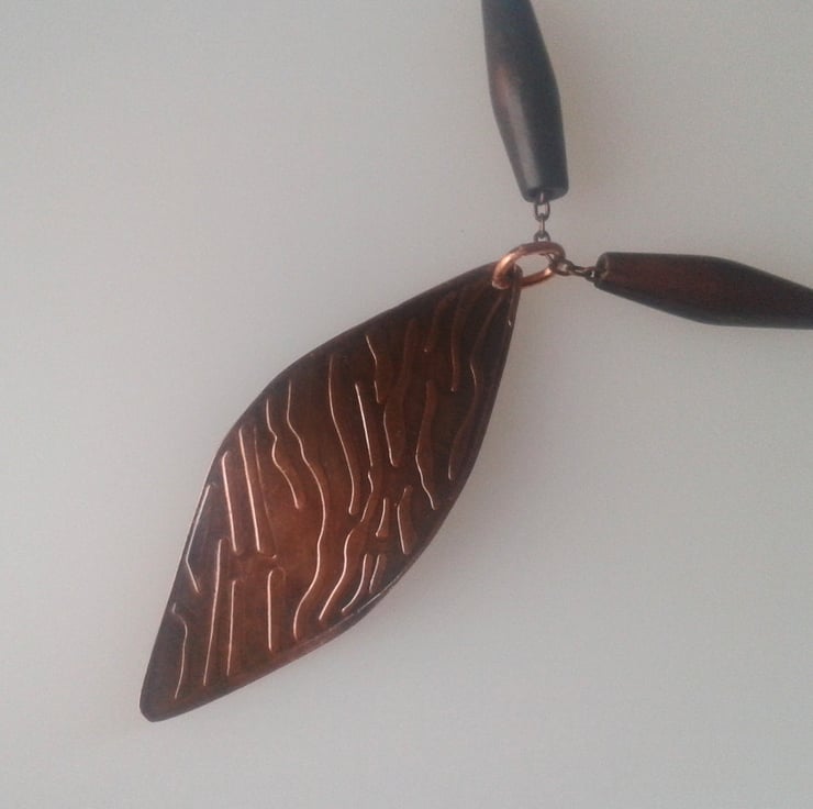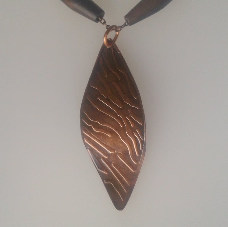 To make this jungle-themed pendant I used a rolling mill to imprint a rippled or tiger-striped design onto copper sheet and then cut around it with a piercing saw and smoothed the edges. I treated the copper with oxidising solution to define the pattern and darken it to an antique bronze colour. The high areas were polished to a lovely warm glow and then the pendant was treated with two coats of metal lacquer to avoid further oxidation and to minimise direct contact with the skin. The gently curved surface enhances its reflective properties. I added a wire loop bail and threaded the pendant onto antique copper coloured chain, secured by a handmade hook and ring. Two long beads of natural warm brown mahogany wood offset the pendant and harmonise beautifully with the colours.
