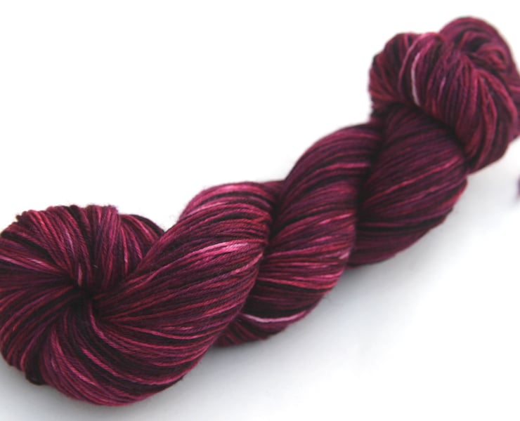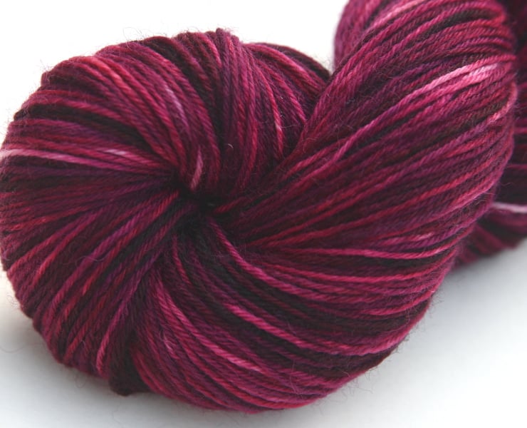 Pinks, maroon and purple with hints of near-black. This Superwash New Zealand Polwarth 4-ply yarn is soft (Polwarth is reputed to rival merino for softness) and should make beautiful hats, scarves, shawls and other accessories. Photos have been taken and edited in wintery but bright natural light.
