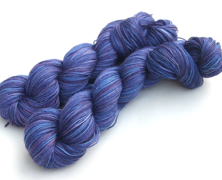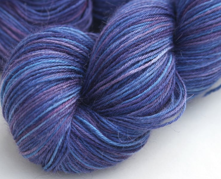 Shades of lavender blues, pinks, lilacs and violets. This gorgeous and luxurious yarn has the softness and warmth of alpaca with the smooth sheen and cool feel of silk. This is the 4-ply/sock weight equivalent of the my bestselling silky baby alpaca laceweight, and combines the softness and luxury of the baby alpaca/silk blend with the versatility of 'sock' yarn. Photographs have been taken and edited in wintery but bright natural light. There are two skeins available (price shown is for one).