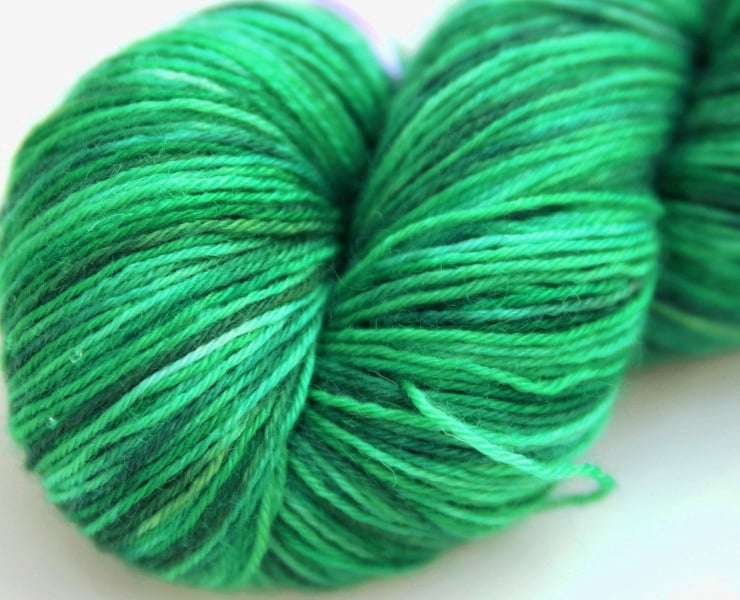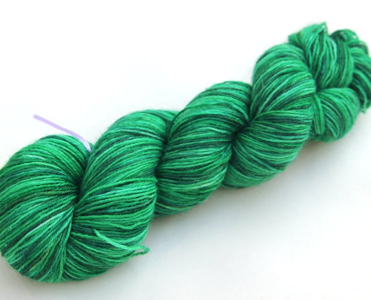 Variegated emerald greens. This Bluefaced Leicester superwash yarn is soft with a very slight lustre. Photographs have been taken and edited in wintery but bright natural light.