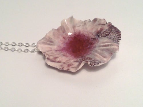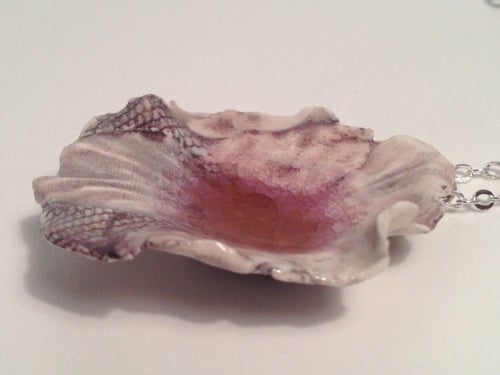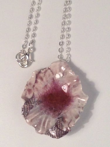A textural porcelain necklace hand shaped with love and fired twice with a gorgeous raspberry pink glaze and glass.