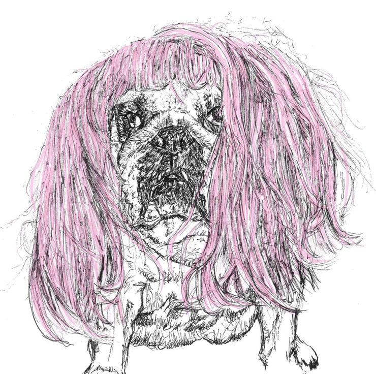 Love dogs? Share the love by giving friends and family this unique card for their birthday or celebration. Printed from an original Ink Pen drawing by Kelly Stanley, this card features Queenie the Olde English Bulldog ready for a big night out in her fab pink wig! This card could be used for a birthday, Mother's Day, or lots of other celebrations!