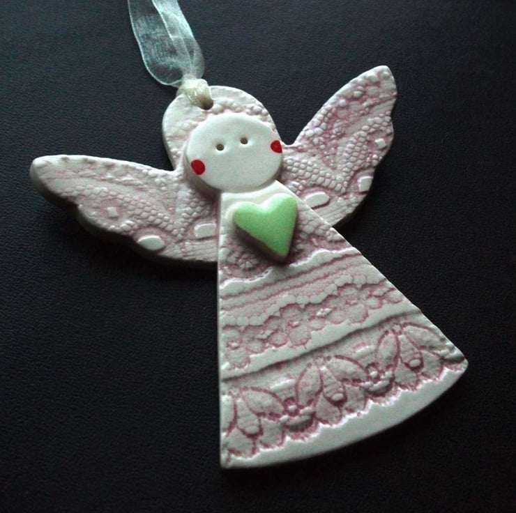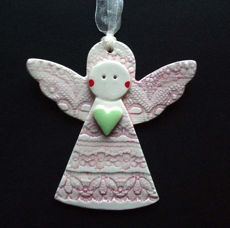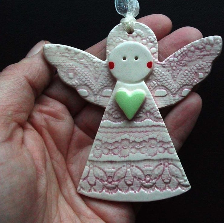 These cute little angels are made from white earthenware clay and decorated with coloured slips and glazes.