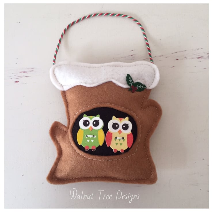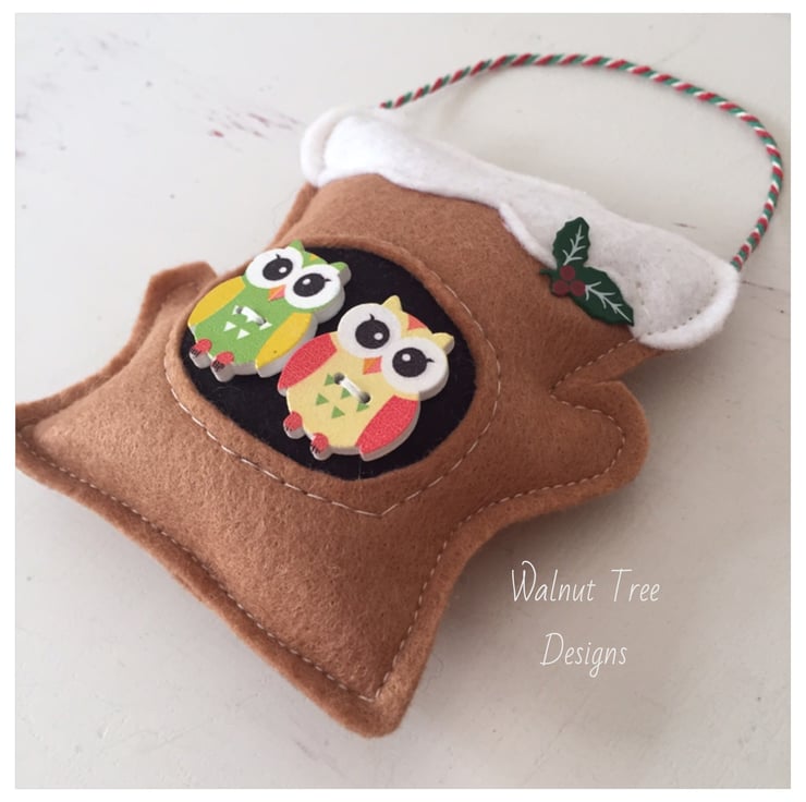 Felt tree decoration featuring 2 owls. Owls may vary in colour from those pictured.