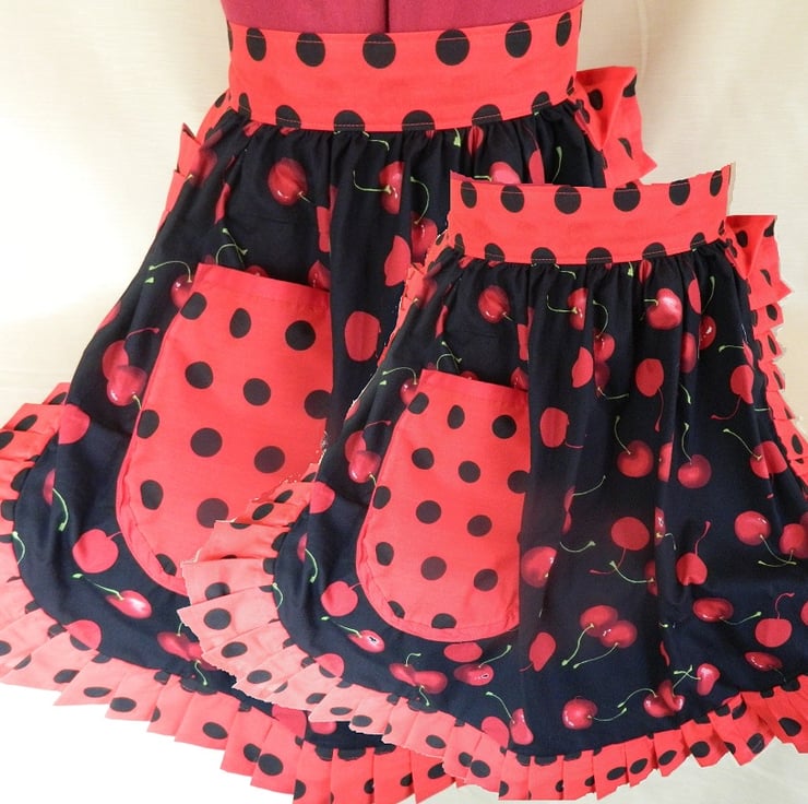 Here we have a lovely mother and daughter matching set, cotton rich black and red cherry retro style aprons, handmade in house to our own design. (see photos). Adjustable waist ties so will fit up to a size 22 on the adult version and a child up to age 7/8.