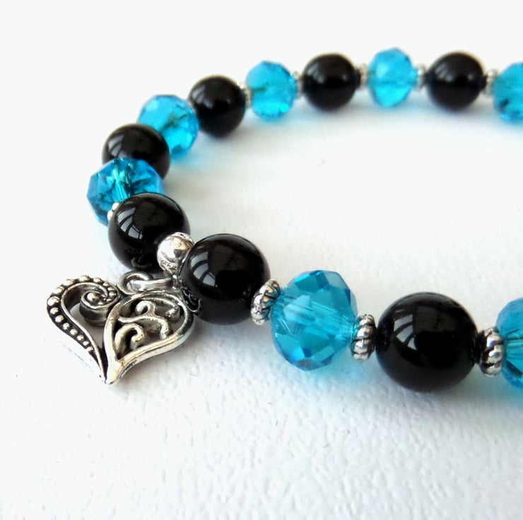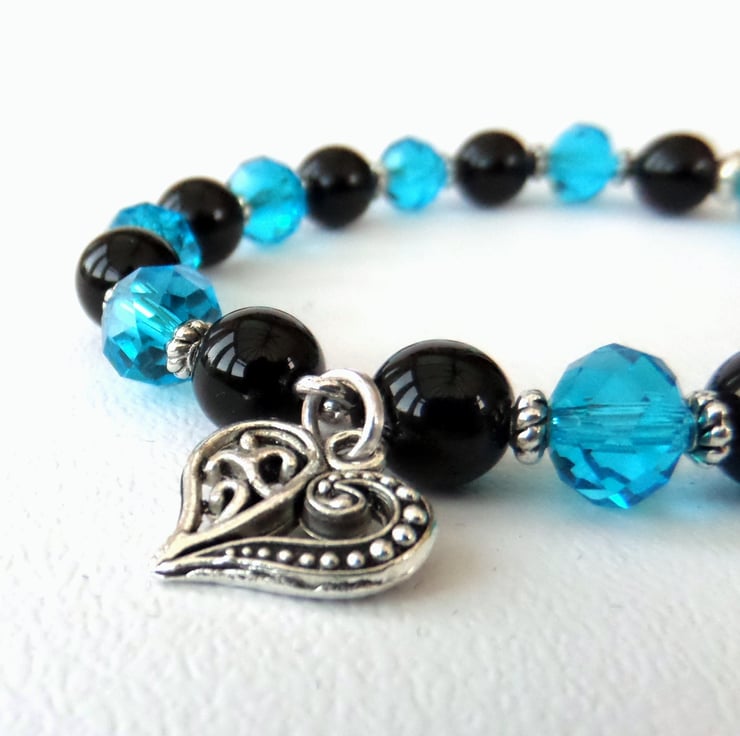 I have added narrow tibetan silver rondelles between the onyx and crystals to accentuate them, and completed the bracelet with a pretty tibetan silver heart.