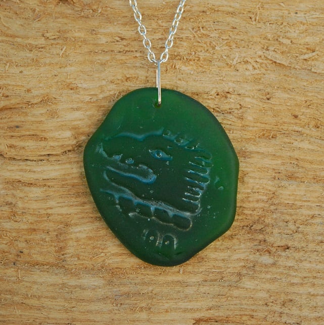 This is a very unusual pendant which we have made from the bottom of an old gin bottle. The pattern is of a dragon's head, which was a symbol of the glass manufacturer who made the bottle. We found the broken bottle bottom on the beach and have tumbled it so the edges are rounded and smooth. The image of the dragon is embossed, so it catches any light from the side, and the reflection from the glass around it had a silvery look.