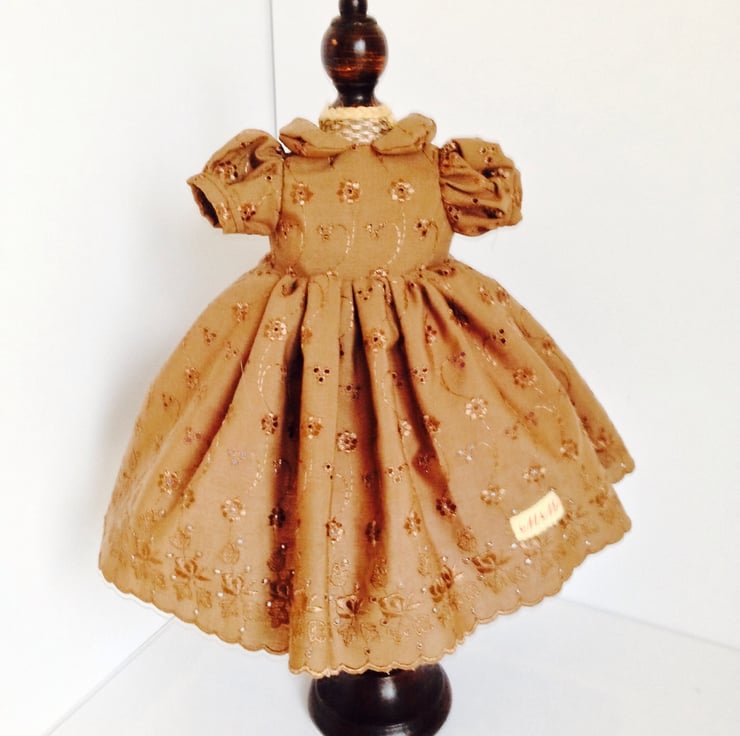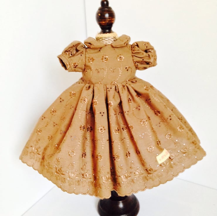 A beautiful light brown dress in flower embroidered fabric with puffed sleeves and Peter Pan collar. This dress is really pretty.