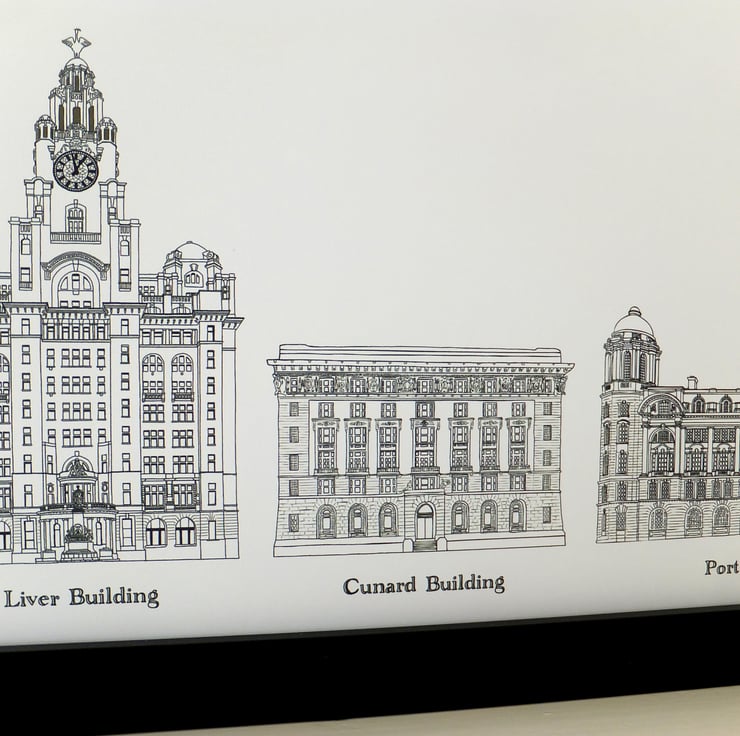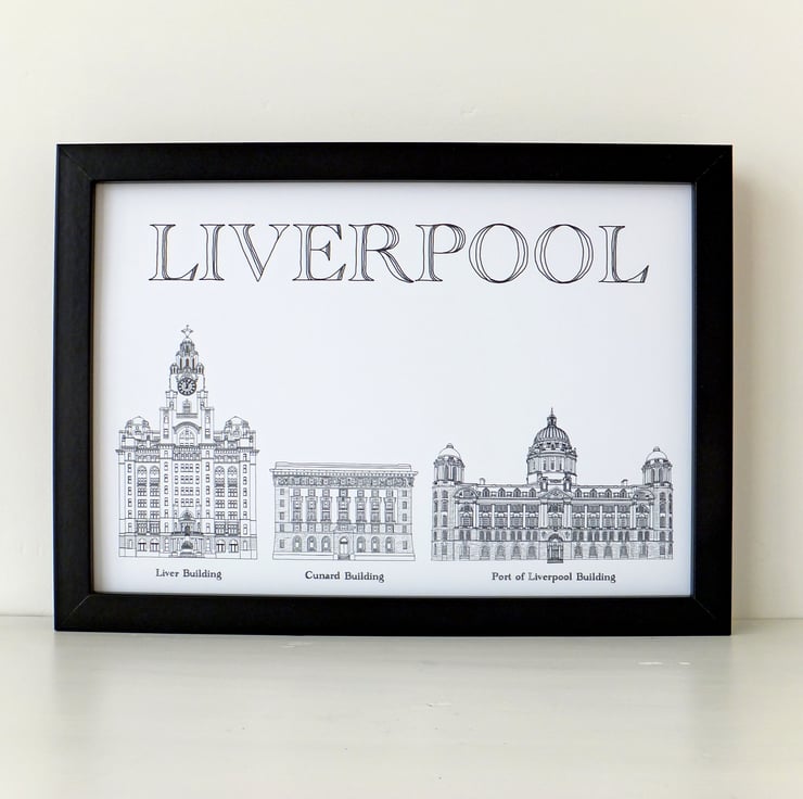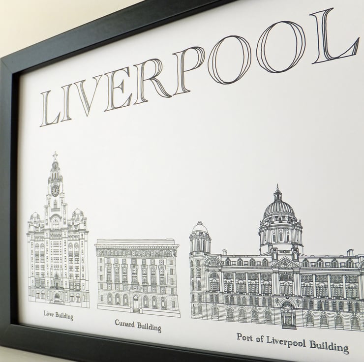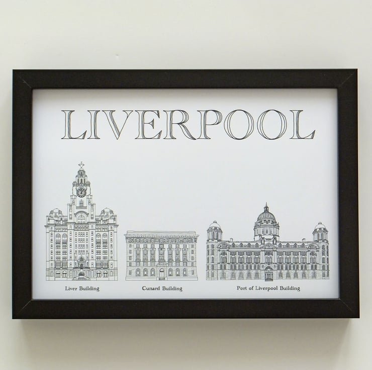 A fabulous print of Liverpool's "Three Graces" - the Liver Building, Cunard Building and the Port of Liverpool building, all in Liverpool, England. A wonderful piece of art for your home. A fabulous gift for anyone who loves Liverpool.