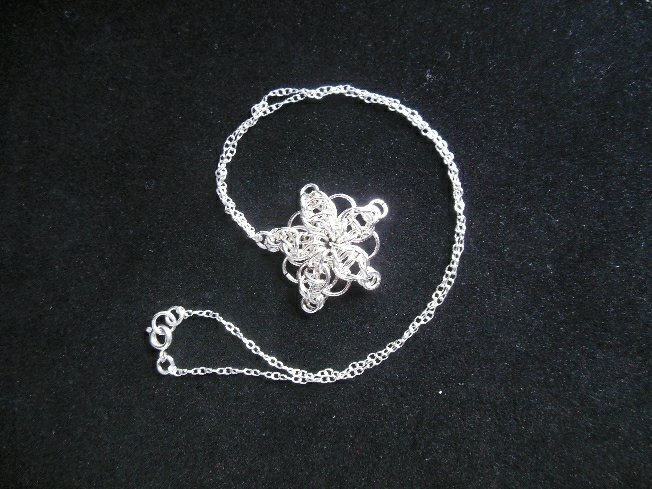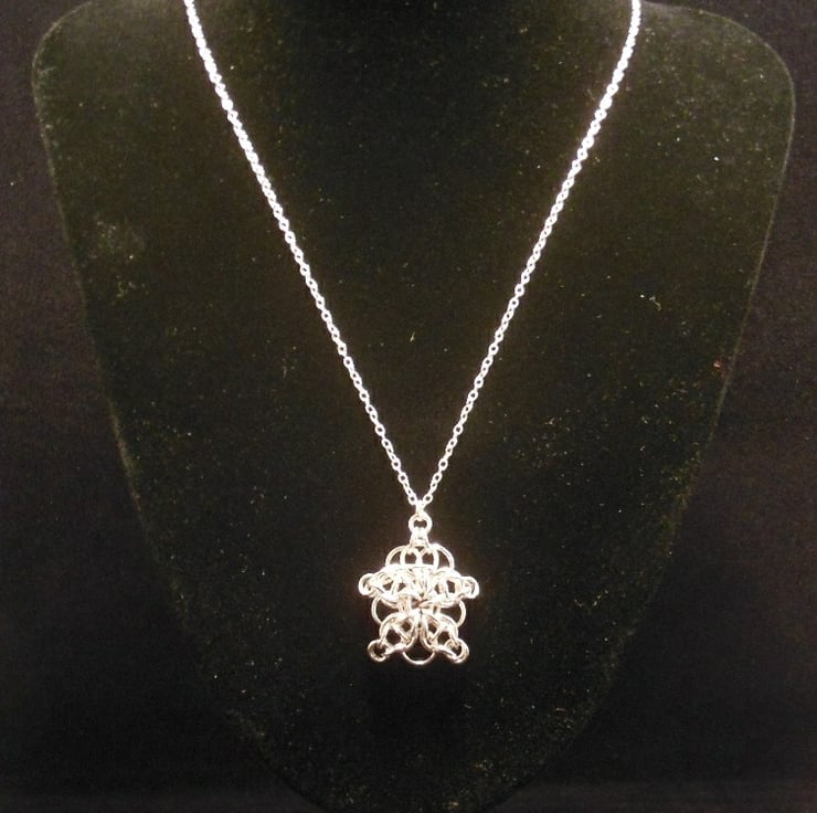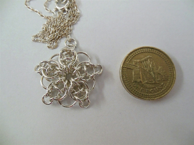 Each piece starts life as one continuous length of 0.9mm wire which I hand wind into coils before cutting into rings with a piercing saw. The rings are then woven into a pattern specific to its origin, the foundation for this piece is the Celtic weave. The woven rings are manipulated into a pattern .The mail is then incorporated into the final piece by attaching and finishing to a chain. The piece is then put into polish.Once finished the piece is wrapped in acid free tissue paper, put into and put into an organza bag. The bag is inserted into a pillow box with the addition of some raffia if the package needs more padding.The pillow box is finished with a ribbon and put into a padded bag ready for despatch.