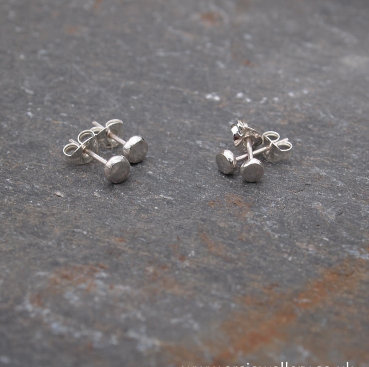 A tiny piece of recycled silver has been hammered to shape and add texture to the surface. These little studs are not uniform so have a lovely organic feel to them and make great stud earrings for everyday wear or for a second...third...fourth piercing.