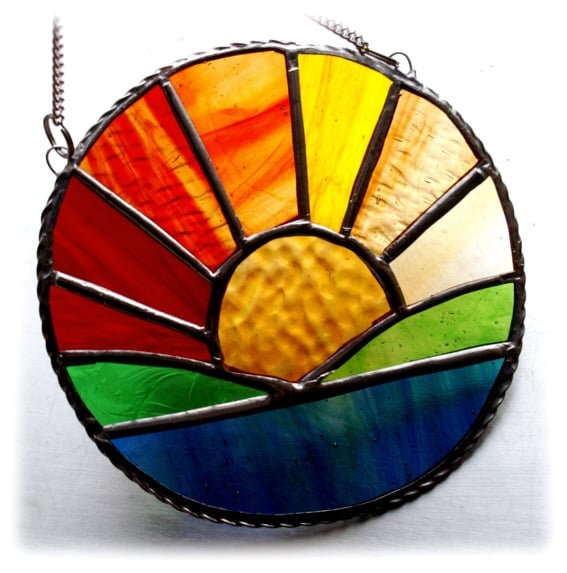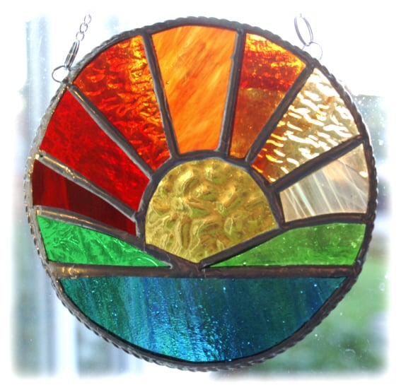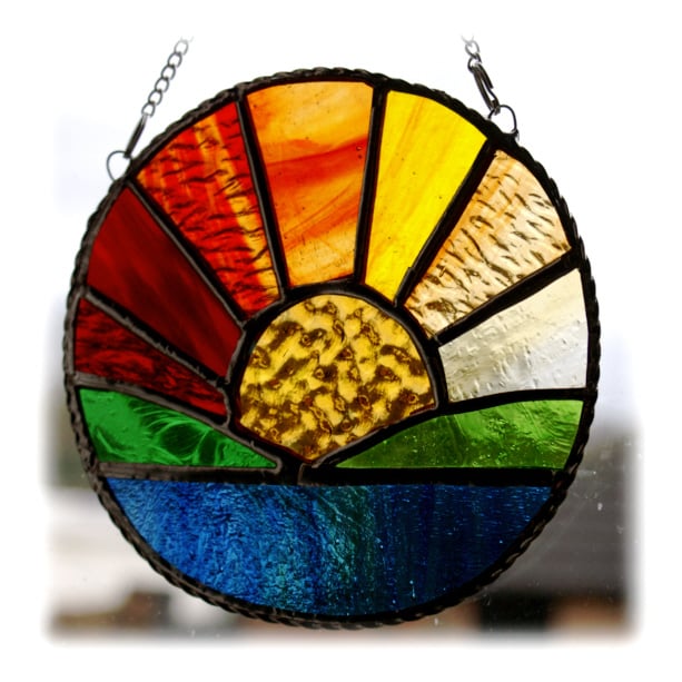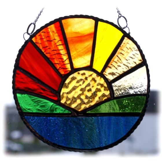 The sun's rays are made from 7 different colours and textures of red, amber and yellow glass with lots of streaks to denote the rays.