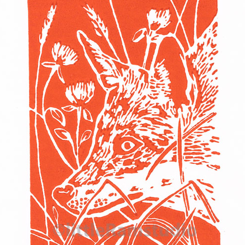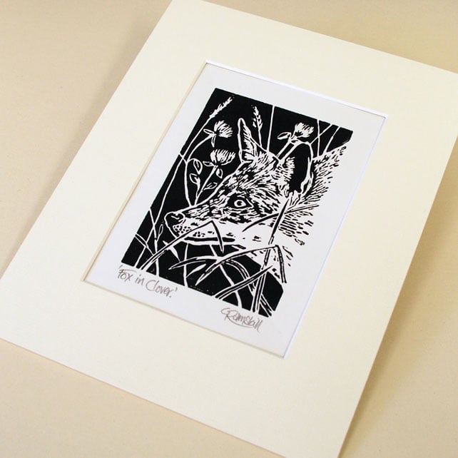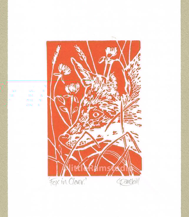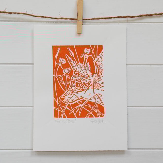 'Fox in Clover' - Original, hand pulled Linocut Print, printed on hand press, available in red or black ink. Supplied in a cream mount.