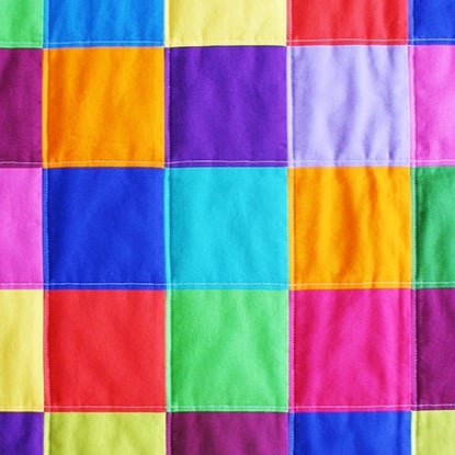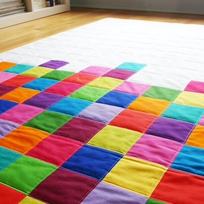 Pixelated quilt or throw using a sharp balance between coloured and white squares for a modern vibrant feel.
