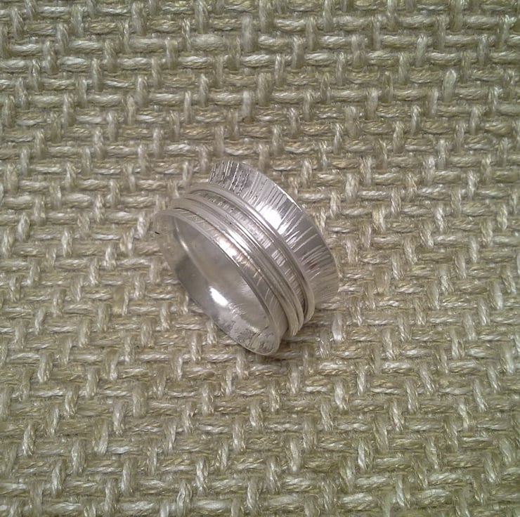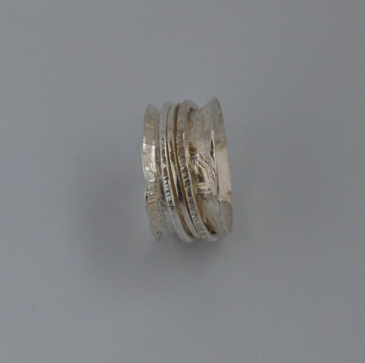 Beautifully handmade this sterling silver Spinning ring is stylish and contemporary. A simple 12mm wide band textured then topped by three satellite rings that move freely around the central ring.