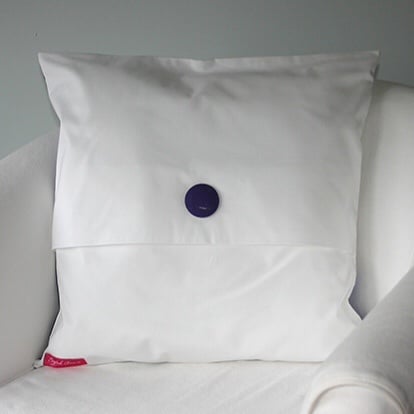 The reverse of the cushion is solid white, with an envelope opening for easy handling and removal. It includes a decorative handmade button in the centre of the reverse. The cushion inner, which is 100% polyester fibers, is also included.