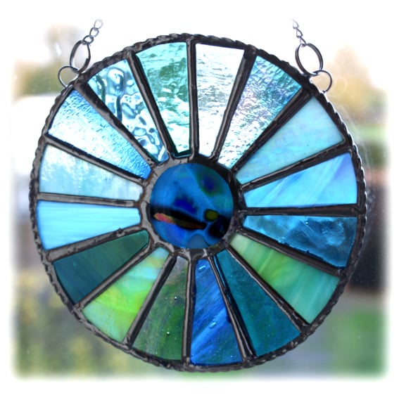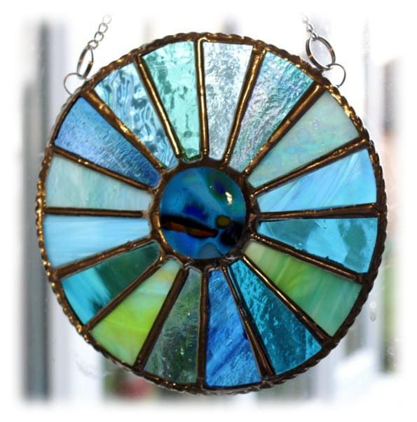 The nugget is then set this inside a segmented circle using some 16 different types of glass, lovely shades and textures covering the colour spectrum of the sea.