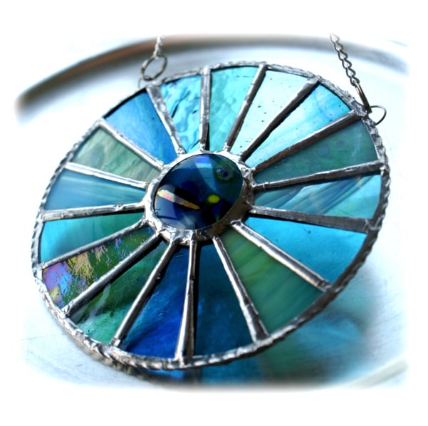 This is 13cms in diameter and hangs from a little silvery chain which is securely attached to the top of the suncatcher.