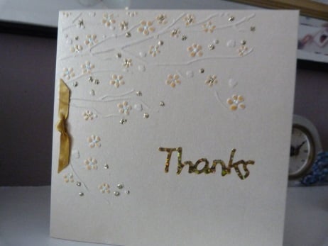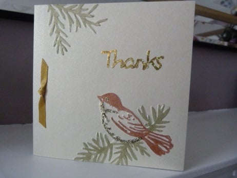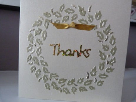 A pack of 3 assorted design thank you cards. Consisting of 3 different designs 1) A branch of a flowering tree 2)A circle of leaves and 3)Bird sitting on pine branch. Each design embossed onto quality pale gold pearl card and hand coloured. Enhanced with fine gold glitter. 'Thanks' die cut from gold holographic card. Finished off with a gold ribbon.