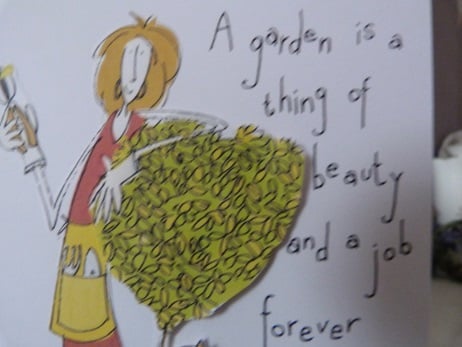 A lady ready to do a bit of topiary onto a potted tree decoupaged onto pristine quality white card. The words 'A garden is a thing of beauty and a job forever' handwritten in black ink along with happy birthday.