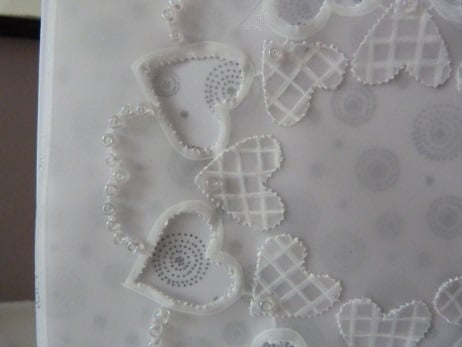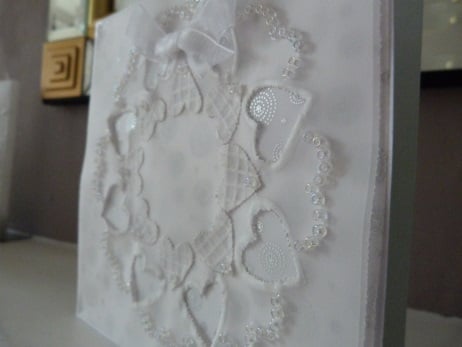 A completely hand made catd consisting of a circle of hearts which have been embossed and cut onto parchment. The cut out hearts make an inner circle. All interlinked with another circle of hearts which have been emphasised with clear glass beads. The parchment is mounted onto foiled vellum then onto pristine white quality card. Finished off with white organza bow.