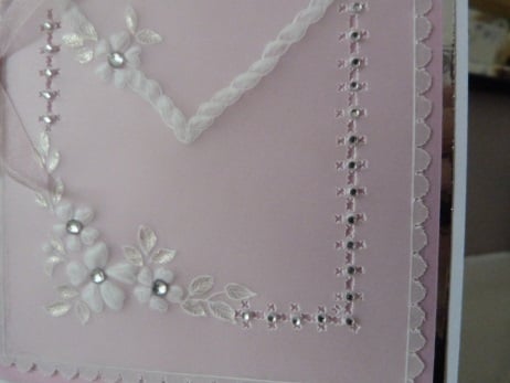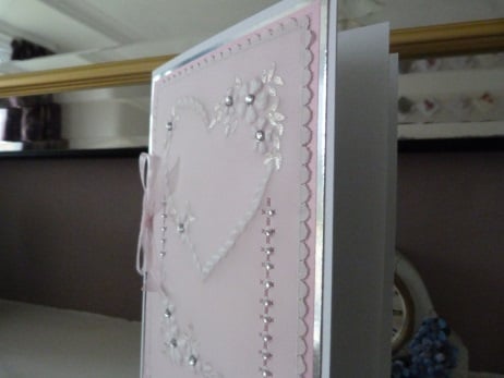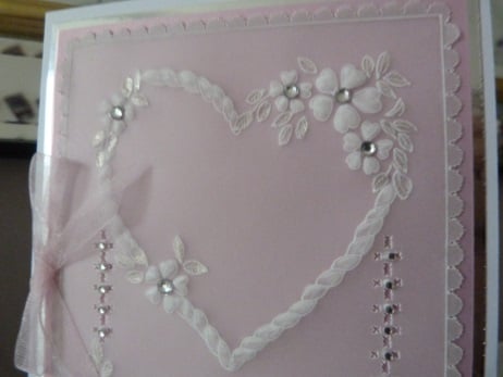 A completely hand made card consisting of a plaited heart and flowers embossed, cut and pierced on parchment. The edges have been cut into pretty scallops. The flowers and squared edges have been decorated with clear rhinestones and finished off with a pink organza ribbon bow. Mounted onto pale pink vellum and then onto silver mirri card and then onto pristine white quality card.