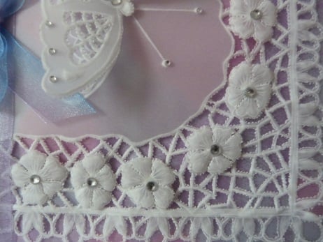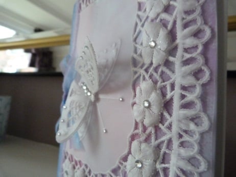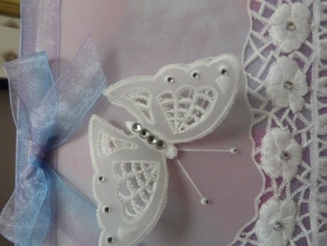 This is a completely hand made card which is so special. Consisting of a butterfly in two layers which has been embossed cut and pierced onto parchment mounted onto parchment which has an intricate lacy pattern cut out. Embellished with double layered flowers. Further decorated with silver rhinestones and a blue/pink shaded organza ribbon and bow. Mounted onto blue/pink shaded vellum. Then onto pristine white quality card.