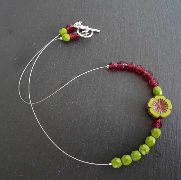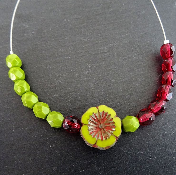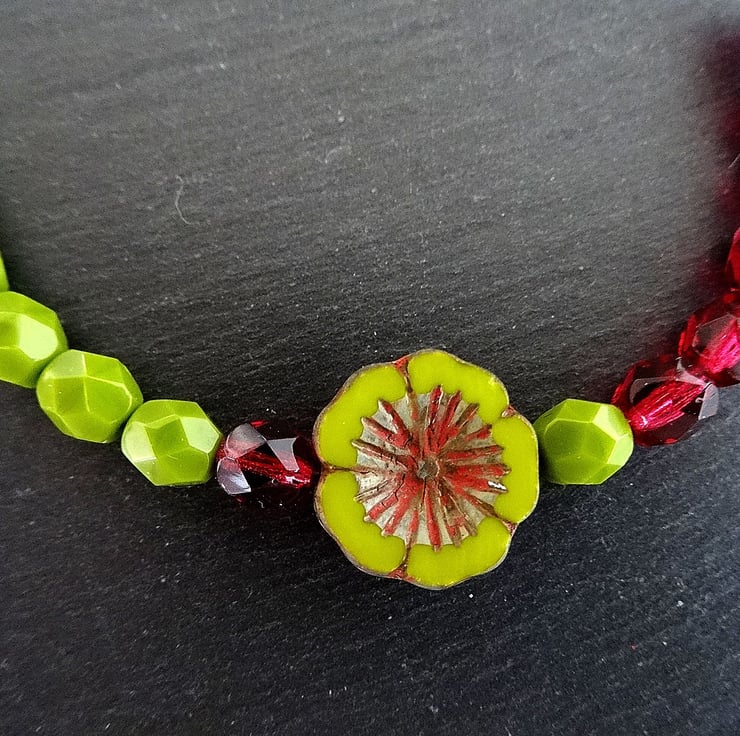 This is a lovely pretty necklace made with 6mm faceted czech glass beads. The focal of the necklace is a beautiful olive and cranberry czech glass Flower bead measuring 14mm. The beads are threaded onto Bedalon 49 strand jewellery wire which is very flexible so gives the necklace a lovely drape. The necklace measures 42cm (16.1/2") and is finished with a toggle clasp. As all of the items in my shop are individual pieces made by myself, this is the necklace you will receive. It will arrive gift wrapped in tissue paper and a organza bag.