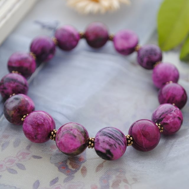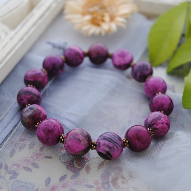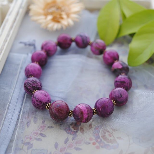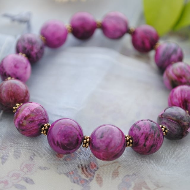 Purple Jasper stretch bracelet made with stunning 12mm beads and antique gold daisy spacers.