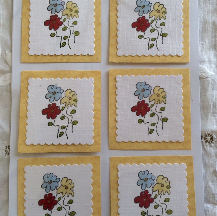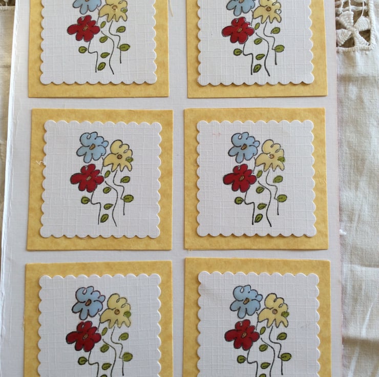 Lovely handmade floral card toppers x 6 each being 2 1/2 inch x 2 1/2 inch in lovely floral design, all hand coloured and cut with the flowers being raised giving a 3 D effect.