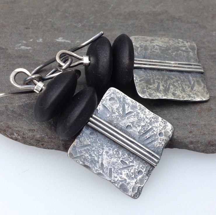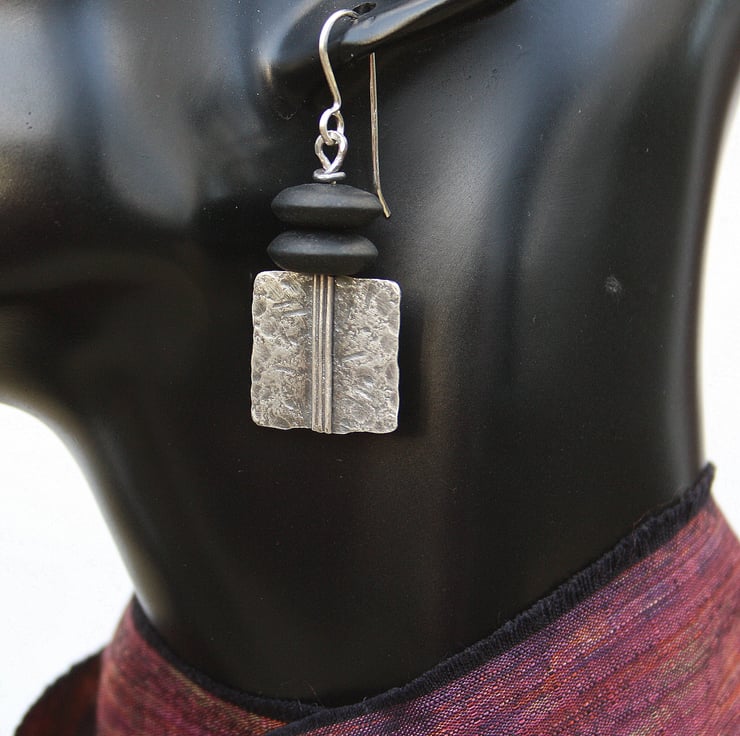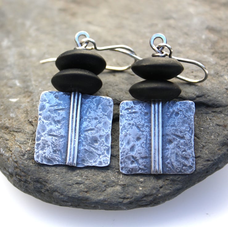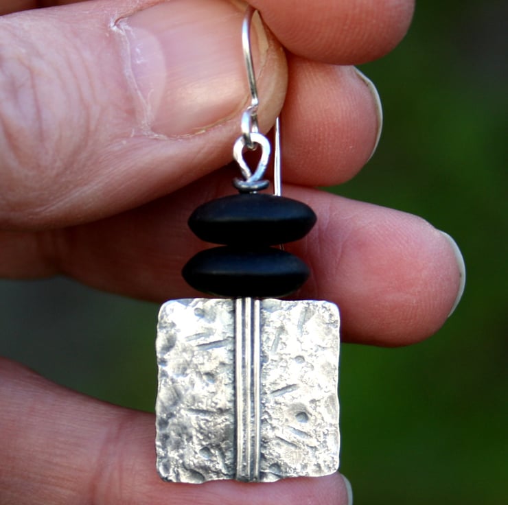 These sterling silver earrings have been beaten and fused for texture, they have an oxidised satin finish to highlight the texture and markings. I have topped them with two large matt onyx beads to add a nice weight and swing.