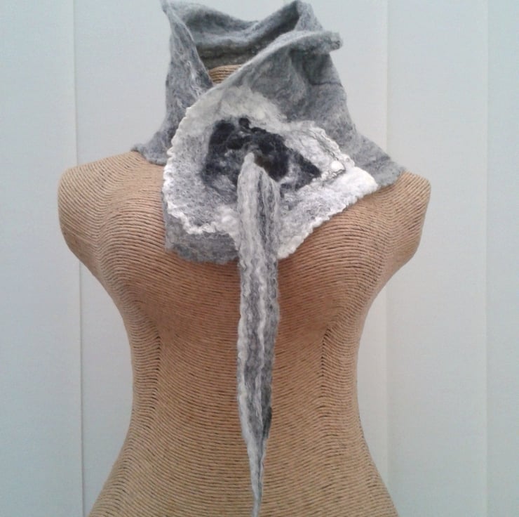 A gorgeously soft wet felted collar in a blend of grey merino wool with silk detail.