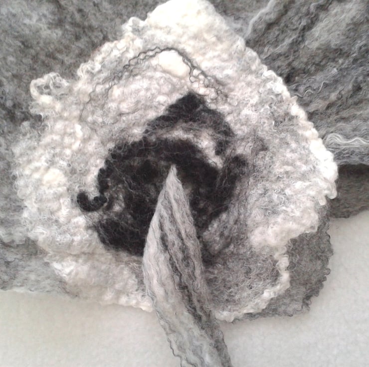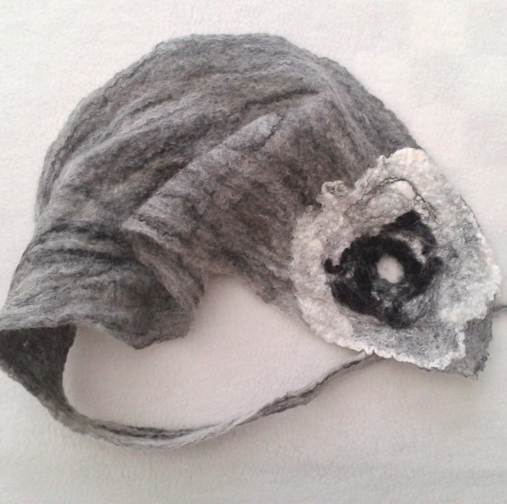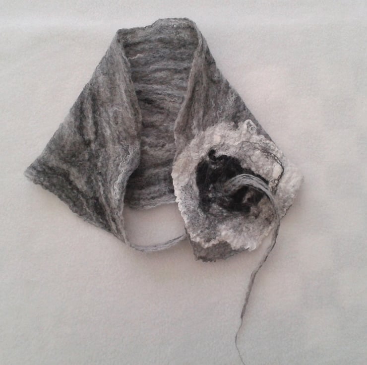 This lovely little scarf has been wet felted to sit around the neck to create a collar or neck warmer style scarf. Felted in a blend of grey and black merino wool a large white mulberry silk flower detail has been added to one end. It is fastened by threading the long tail through an opening in the centre of the silk flower detail.