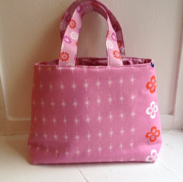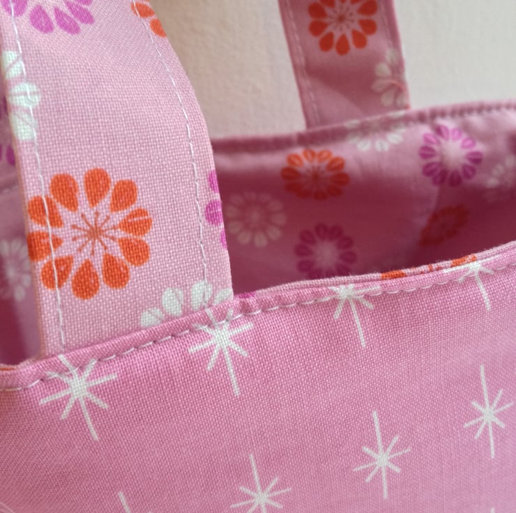 A perfect little toddler bag, fully lined and interfaced with soft wadding make this a perfect bag for little ones. Measures 10 inches by 8 inches. It could easily hold an Easter egg for a handmade Easter gift for a little girl. Fabric used is from the Cotton and Steel Mustang line by Melody Miller.