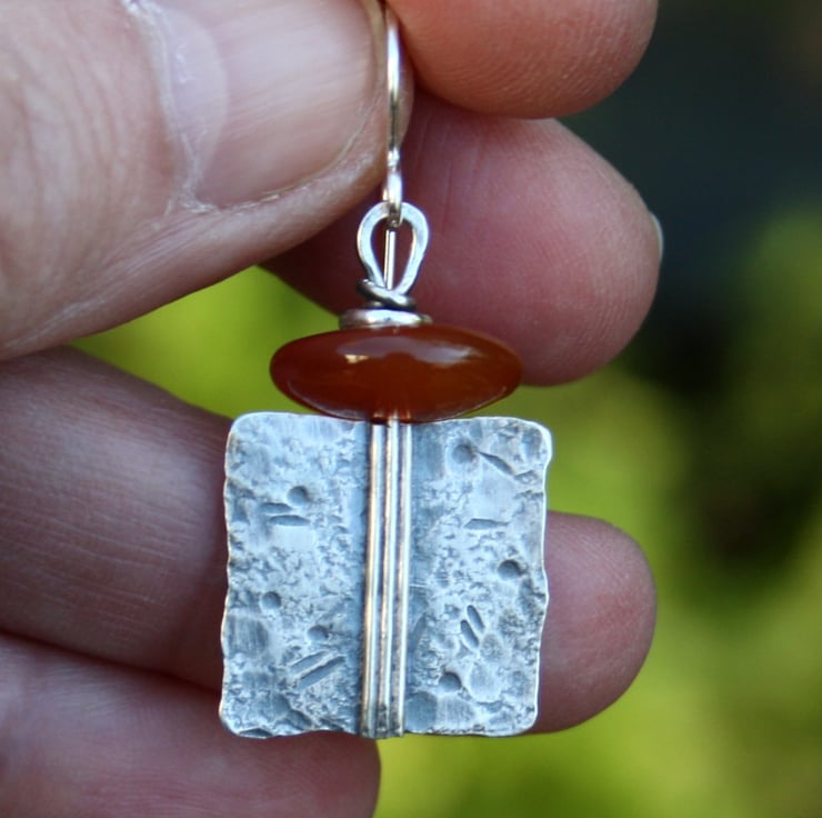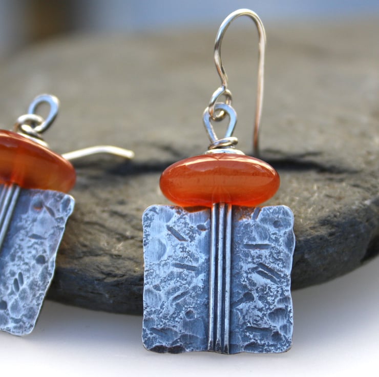 These sterling silver earrings have been beaten and fused for texture, they have an oxidised satin finish to highlight the texture and markings. I have topped them with a large carnelian bead to add a nice weight and swing.