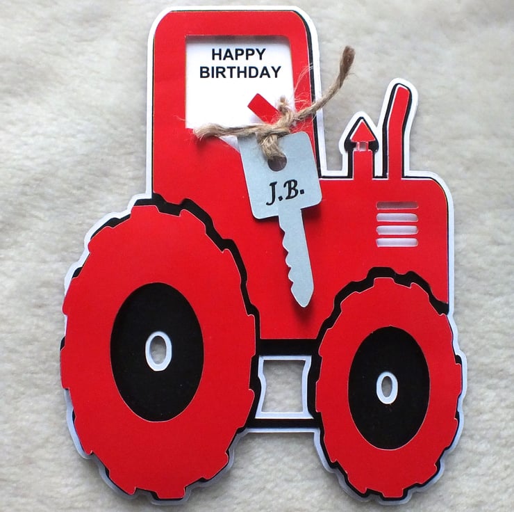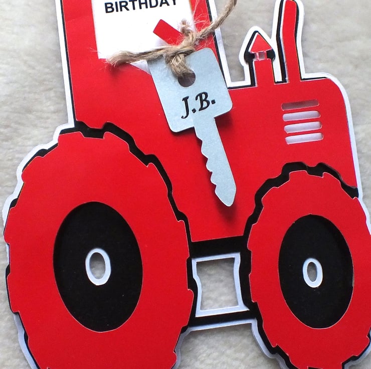 Ideal birthday card for a farmer, or those who love tractors. This handmade die-cut tractor is made using red, white and black gloss card, with a die-cut key which can be personalised. Measures approx. A5 in size. The insert has been left blank for your own message.