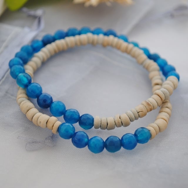 This unique and lovely set of two stretch bracelets is made with beautiful deep teal faceted agate beads and natural coco pucalet beads in a shade called cloudy sky. The set comprises