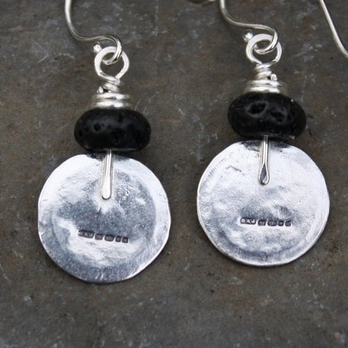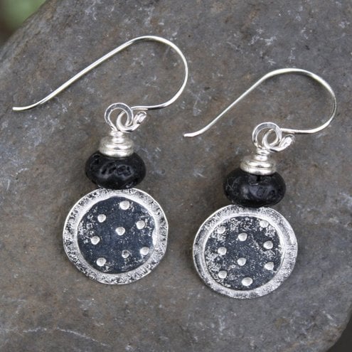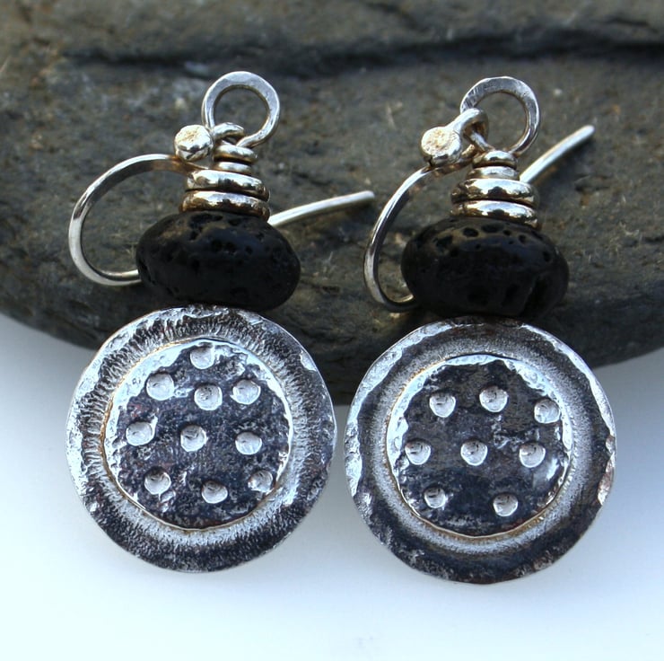 Fused silver discs are punched with a random dotty pattern, and topped with plump gnarly lava stone roundel beads.