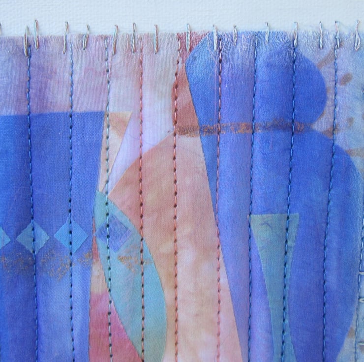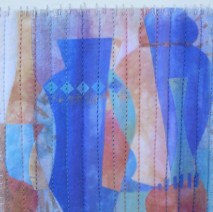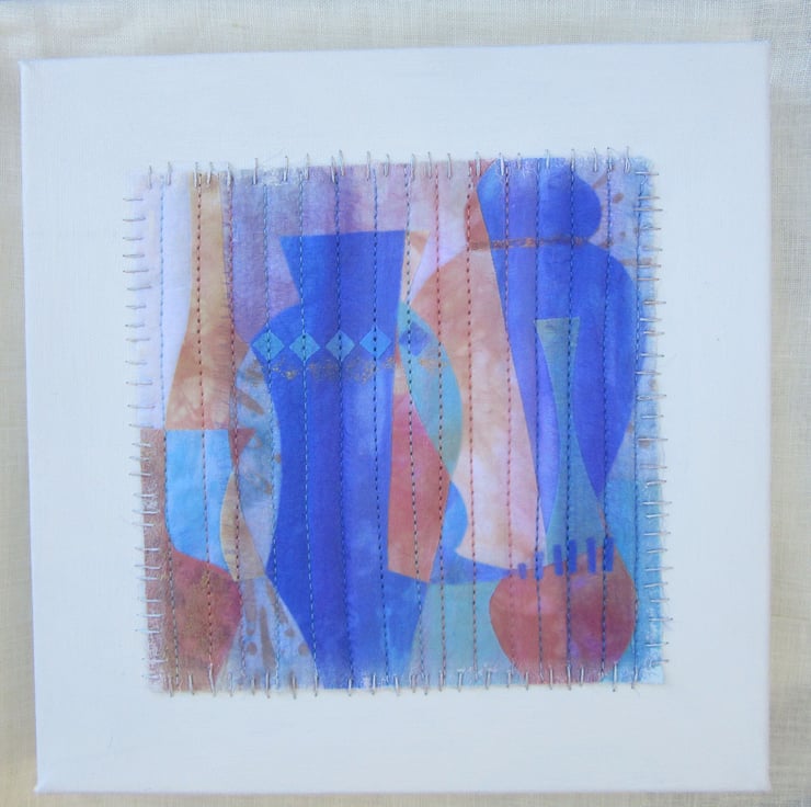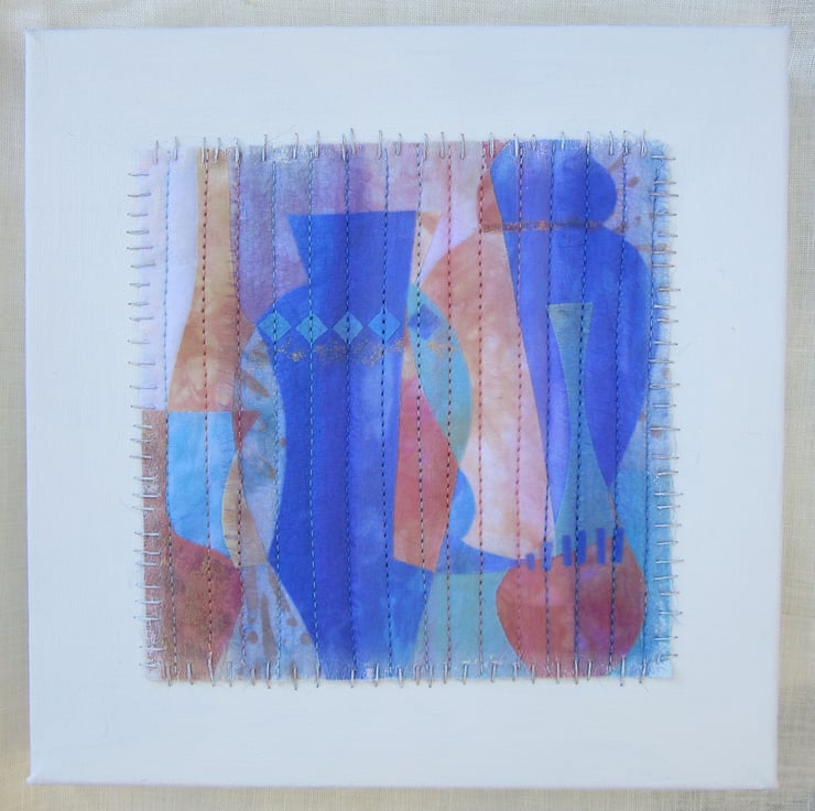 Modern fabric collage that has been decorated with machine stitching. Turquoise, peach and blue hand dyed fabric and a tiny amount of commercial patchwork fabric have been used. A hint of gold has been used to decorate the vessels. When finished the work has been hand stitched to the canvas and a misting of white acrylic paint applied over the edges.