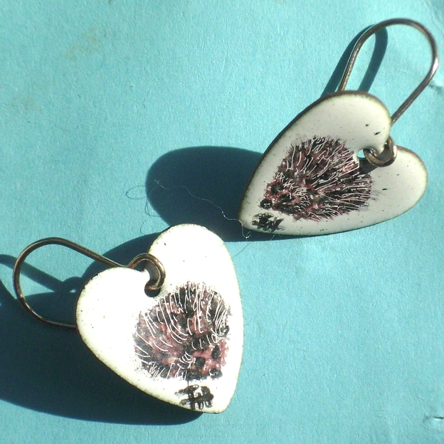 I made these earwires by first making the white enamel hearts, building up five layers of white enamel over the copper shape. Each layer was fired at 800 degrees centigrade (red hot). I then painted the hedgehogs, using tablets of compressed enamel colours soluble in water, like water-colour paints, and fired the piece again at 800 degrees centigrade. The design is signed with my initials, FH, in painted enamel.
