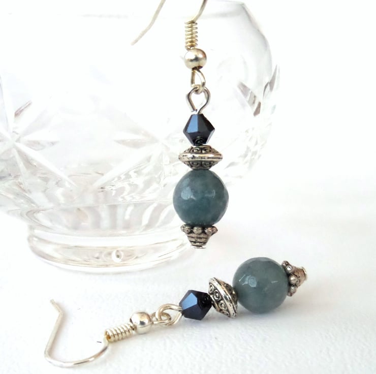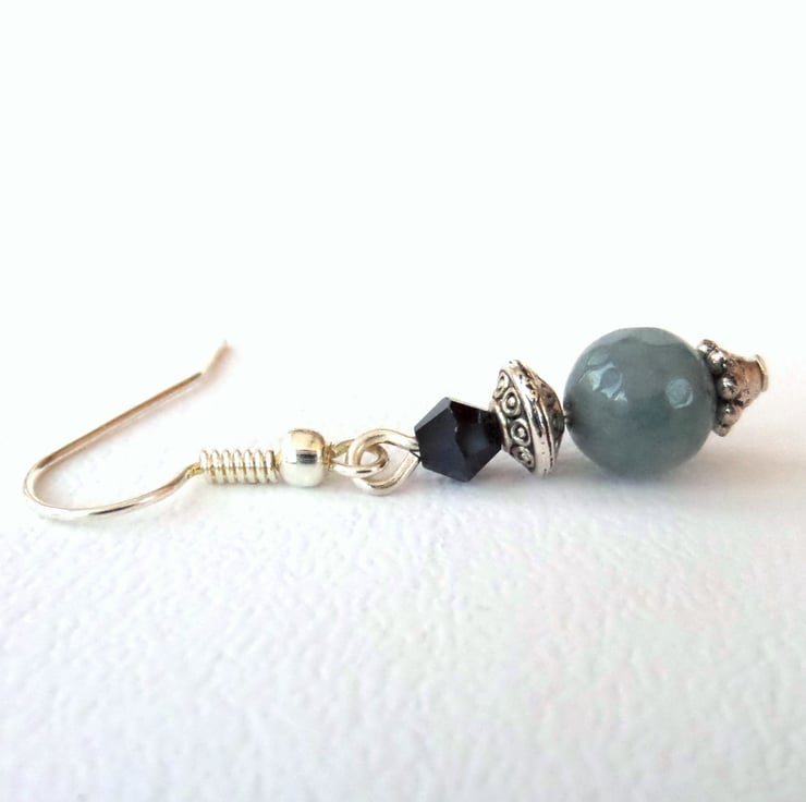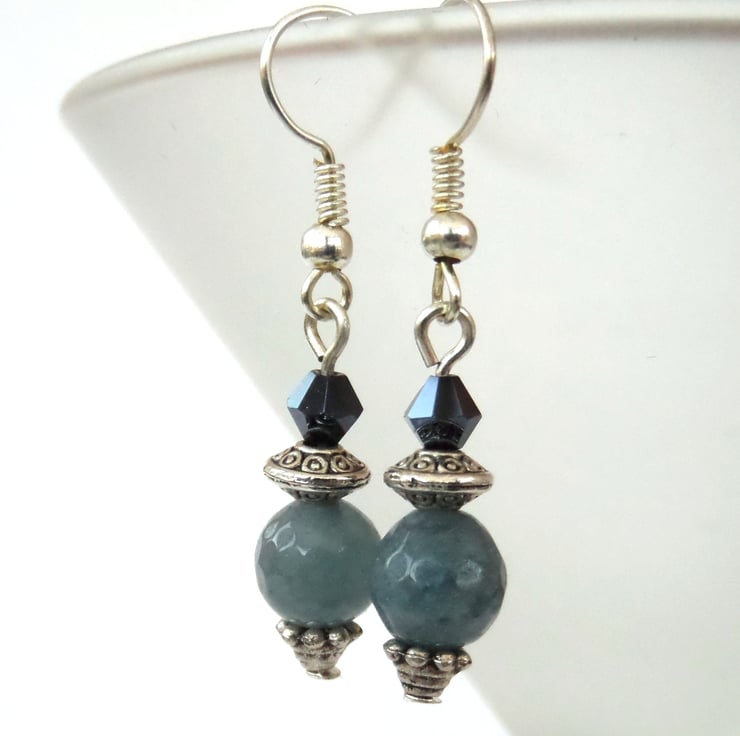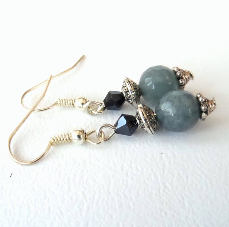 I love the shade of these aquamarine earrings, and set against the silver beads and wires and jet crystal they make a great pair of earrings.