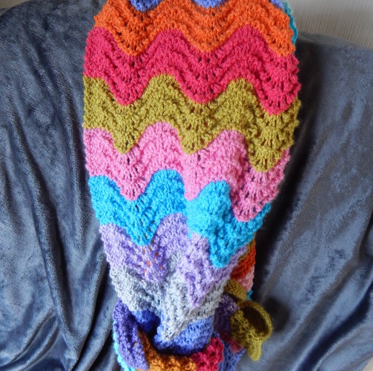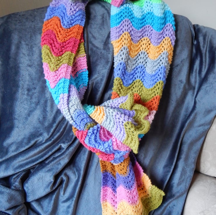 This gorgeously coloured scarf is knitted in fifteen different shades - based on a palette of seaside beach huts. We all need summer colours in our lives, even in the depths of winter! It measures 9 inches across and nearly six feet long.