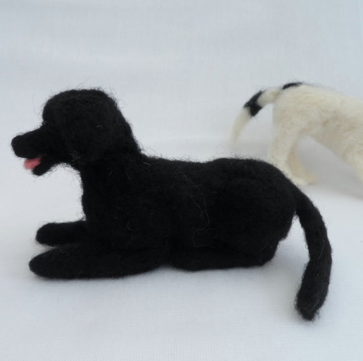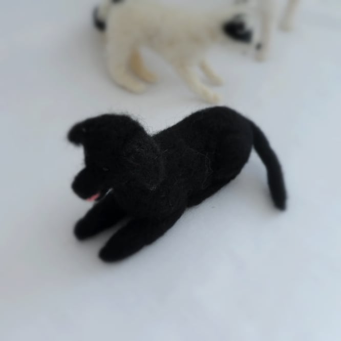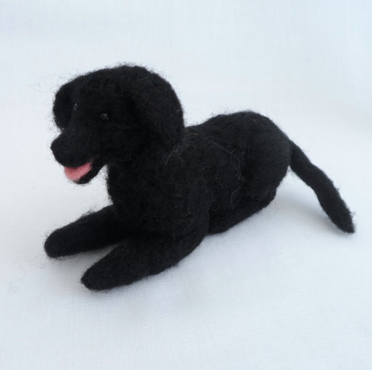 A sweet little needle felted dog looking to be adopted. This black labrador measures approximately 19cm long (tip of nose to end of tail) x 9cm high. A needle felted sculpture using black norwegian wool over a core wool with black beaded eyes, he is sure to be loved by all.