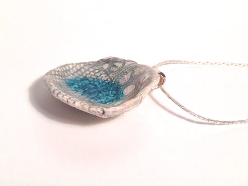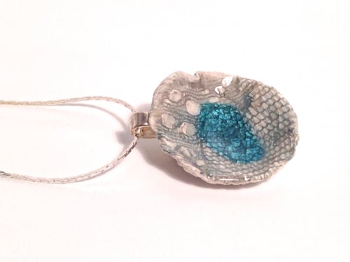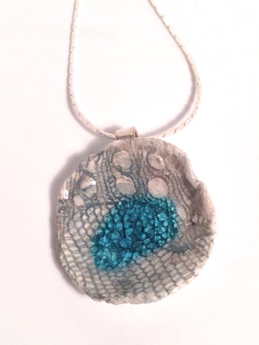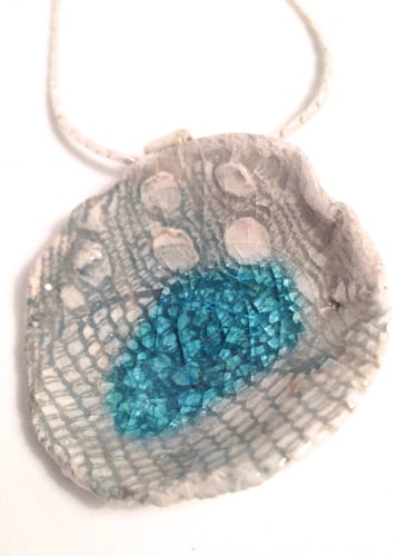A textural porcelain necklace hand shaped with love and fired twice with a slate blue glaze and glass.