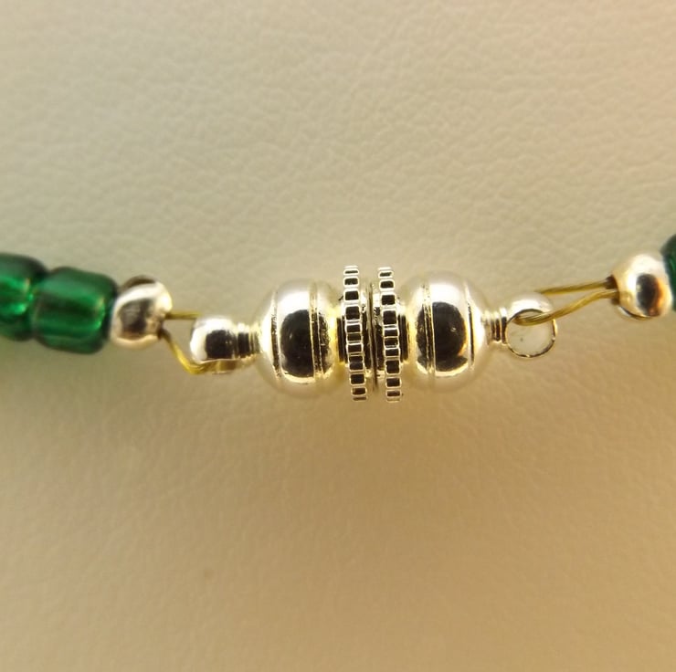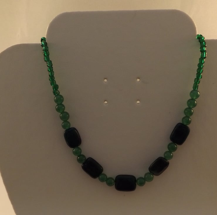 20" length azurite chrysocolla 10mmx14mm and green jade with green glass seed beads beautiful chrysocolla is complemented by the green jade on on tigertail wire with silver plated magnetic clasp. This azurite is used for healing and is known as the stone of heaven.
