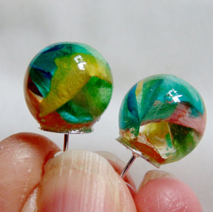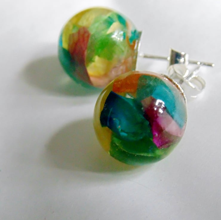 Description: Colourful rose petals carefully sealed in UV resistant, non toxic resin.. these large orbs studs measure approx 13.5mm and are on silver plated ear posts with butterfly backs